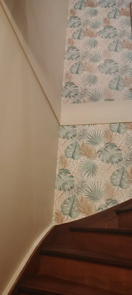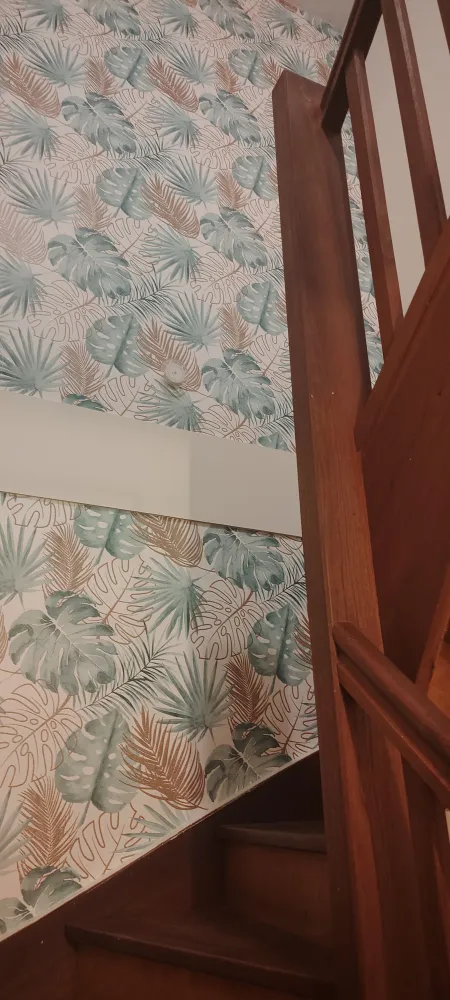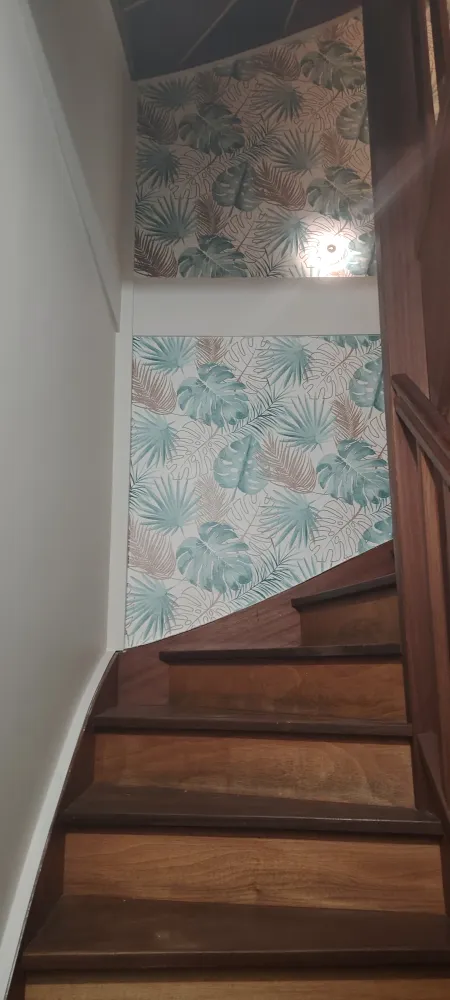 Rénovation d'une cage d'escalier d'une maison sur 2 étages : préparation des murs, ratissage complet des murs, préparation des menuiseries, mise en peinture des murs en mat velours classe 1, pose de papier peint, puis un vernis incolore grand passage sur les escaliers, mise en peinture satin extra blanc en laque acrylique sur 11 portes.