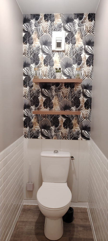 Mise en place d'un BA 13 phonique (maison mitoyenne), ratissage des murs et plafond, pose d'une peinture mat velours couleur café avec soubassement carrelé (METRO). J'ai acté pour garder la trappe de visite en PVC, pose d'un papier peint avec étagères murales.